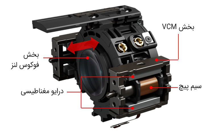 VCM یک موتور محرک با نیروی محرکه بالا است که انرژی الکتریکی را از طریق یک میدان مغناطیسی به انرژی جنبشی تبدیل میکند. واحد لنز فوکوس کننده به یک سیم پیچ متصل است که به صورت خطی در امتداد میدان مغناطیسی ایجاد شده توسط آهنرباهای محرک حرکت میکند.